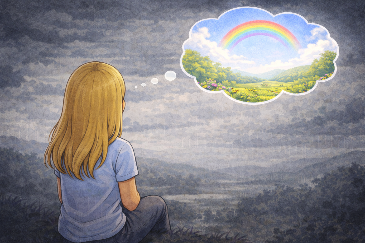 Regnbuen endres fra noe vi forventer og går mot, til en trist drøm vi pakker bort.