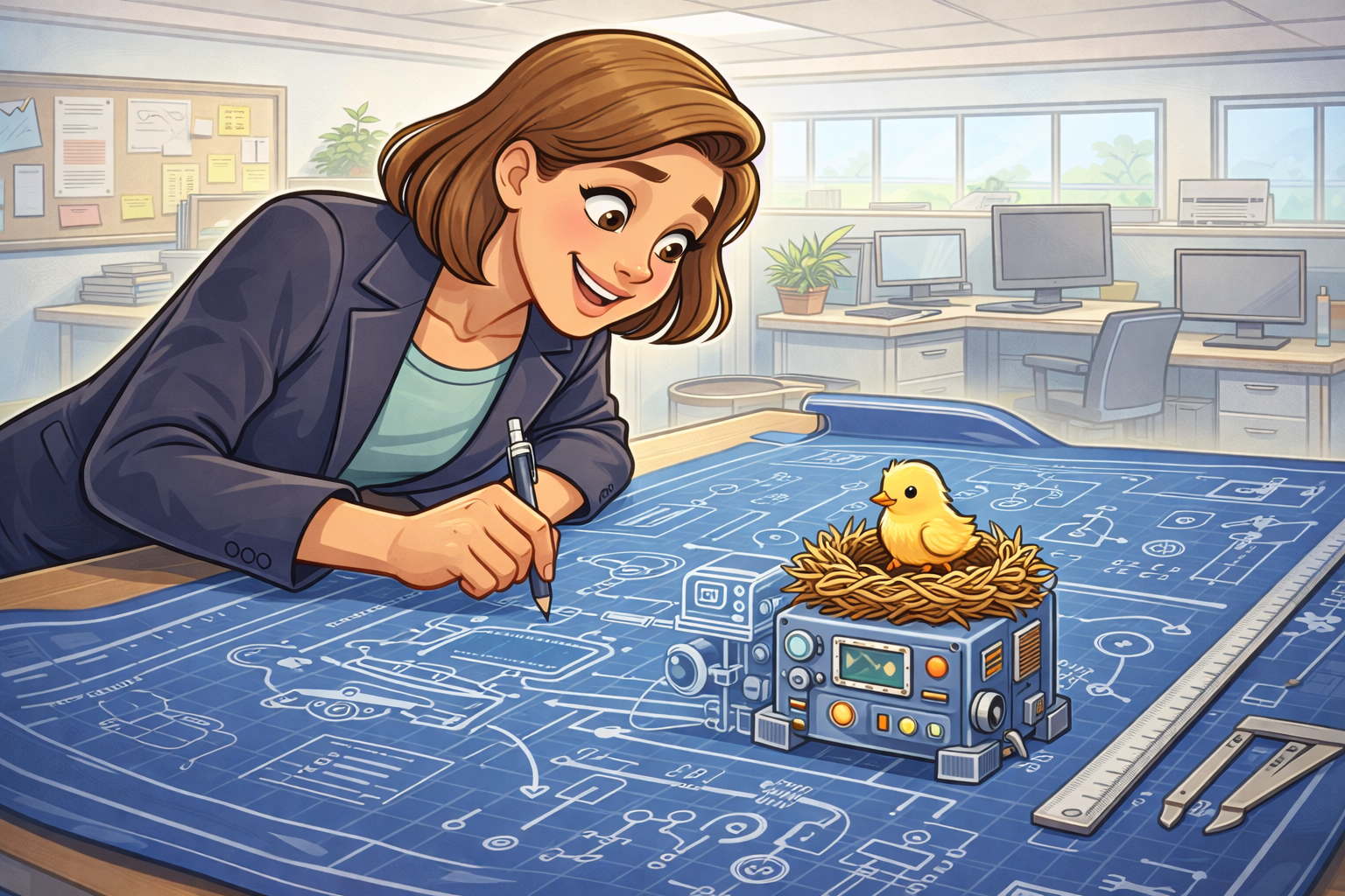 Ved å tenke på det vi skal gjøre som å lage en maskin som hjelper oss å ivareta så går vi automatisk inn i et psykologisk friere landskap.